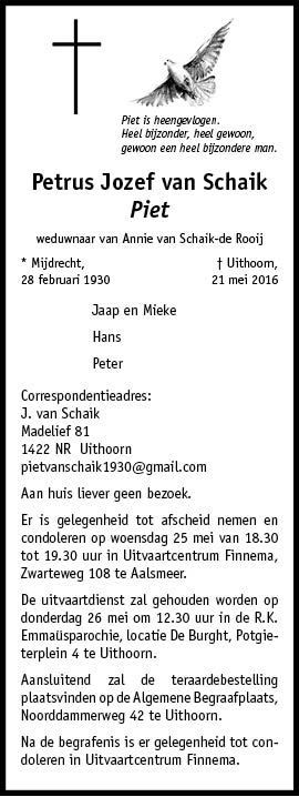 Overleden Petrus Jozef Van Schaik 28 02 1930 21 05 2016